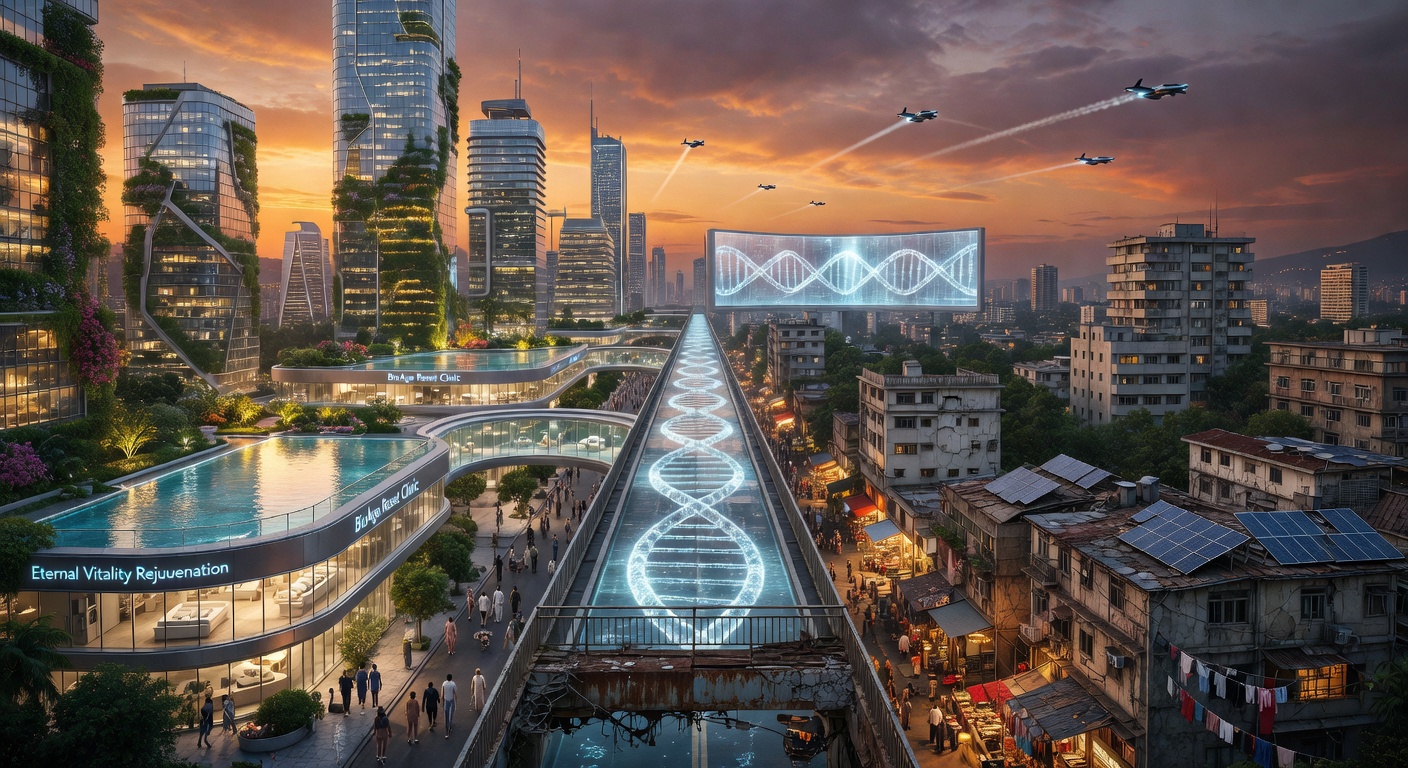 Epigenetic reprogramming worked — but only partially. The wealthy can reset their biological age by 15-20 years, once per decade. They call it Refresh. But partial de-aging creates new stratifications: the Refreshed live in bodies decades younger than their chronological age, while everyone else ages normally. Employment, insurance, and social institutions were built for a world where people grow old together. Now they do not.